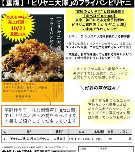 【主婦と生活社】【実用・料理】重版決定! 予約困難の大人気店「ビリヤニ大澤」」のレシピ本 」