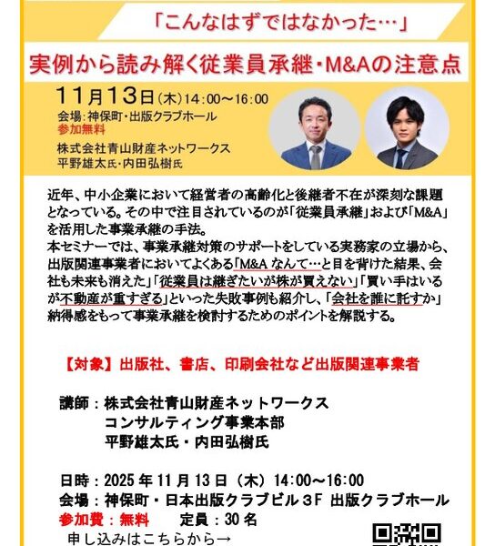 本セミナーでは、事業承継対策のサポートをしている実務家の立場から、出版関連事業者においてよくある「M&Aなんて…と目を背けた結果、会社も未来も消えた」「従業員は継ぎたいが株が買えない」「買い手はいるが不動産が重すぎる」といった失敗事例も紹介し、「会社を誰に託すか」納得感をもって事業承継を検討するためのポイントを解説する。