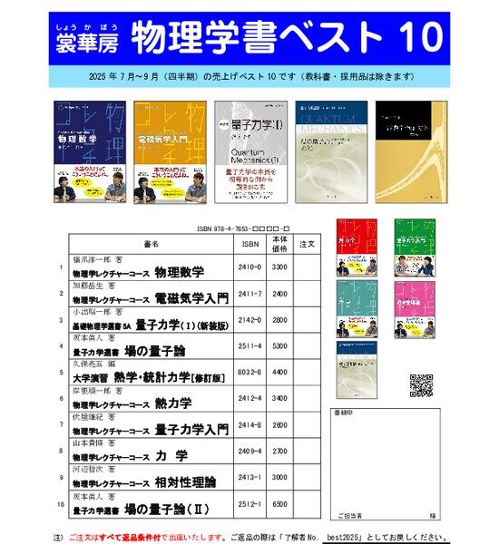 2025年7月から9月までの物理学書のベスト10です。教科書・採用品としてのご注文は除きました。