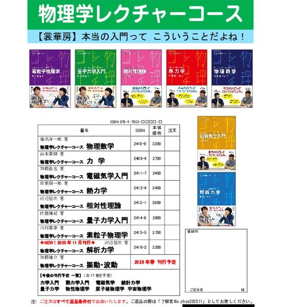 YouTuberとしても御活躍の須貝駿貴さんとヨビノリたくみさんに編集サポーターとして御参加いただいている、好評「物理学レクチャーコース」の既刊一覧です。11月の新刊と明春の近刊を追加しました。