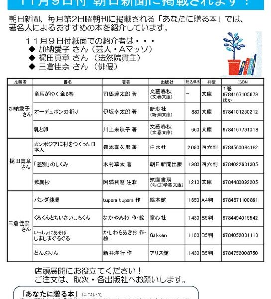 朝日新聞社は若者と子どもに向けて既刊本をおすすめするページ「あなたに贈る本」を掲載しています。毎月第2日曜朝刊に掲載されます。