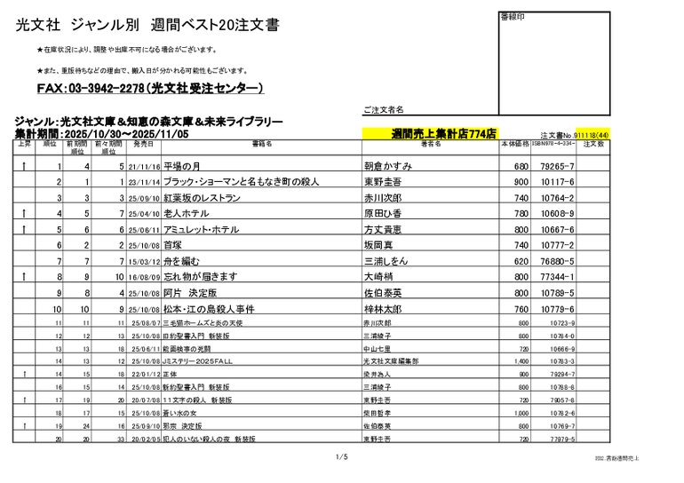 週間ベスト20の注文書を更新しました。(10/30~11/5売上分)