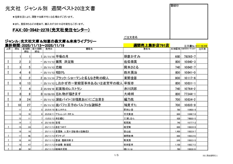 週間ベスト20の注文書を更新しました。(11/13~11/19売上分)