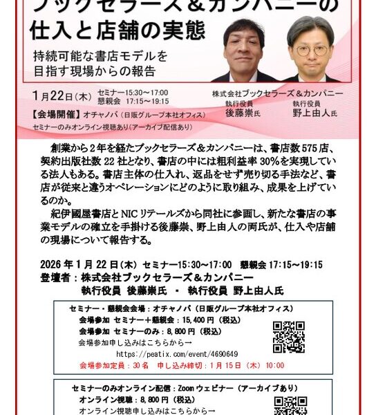 創業から2年を経たブックセラーズ&カンパニーは、書店数575店、契約出版社数22社となり、書店の中には粗利益率30%を実現している法人もある。書店主体の仕入れ、返品をせず売り切る手法など、書店が従来と違うオペレーションにどのように取り組み、成果を上げているのか。紀伊國屋書店とNICリテールズから同社に参画し、新たな書店の事業モデルの確立を手掛ける後藤崇、野上由人の両氏が、仕入や店舗の現場について報告する。