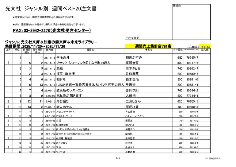 週間ベスト20の注文書を更新しました。(11/20~11/26売上分)