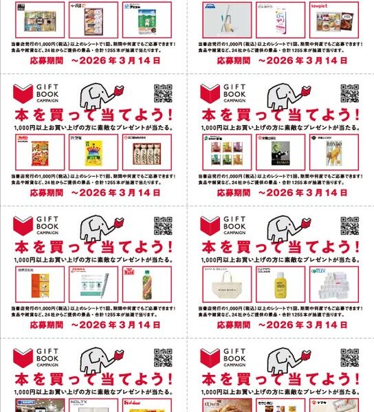 書店で税込1,000円以上購入し、専用サイトからレシートを添付して応募すると、素敵なプレゼントが当たるキャンペーンを実施しています。