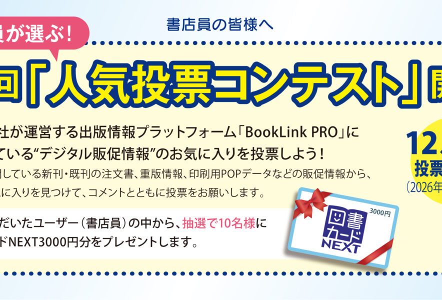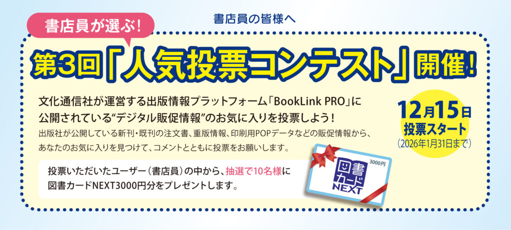 文化通信社が運営する出版情報プラットフォーム「BookLink PRO」で、出版社が発信する注文書などを見て、お気に入りを書店員が投票する「人気投票コンテスト」が、12月15日に始まった。投票期間は2026年1月31日まで。
