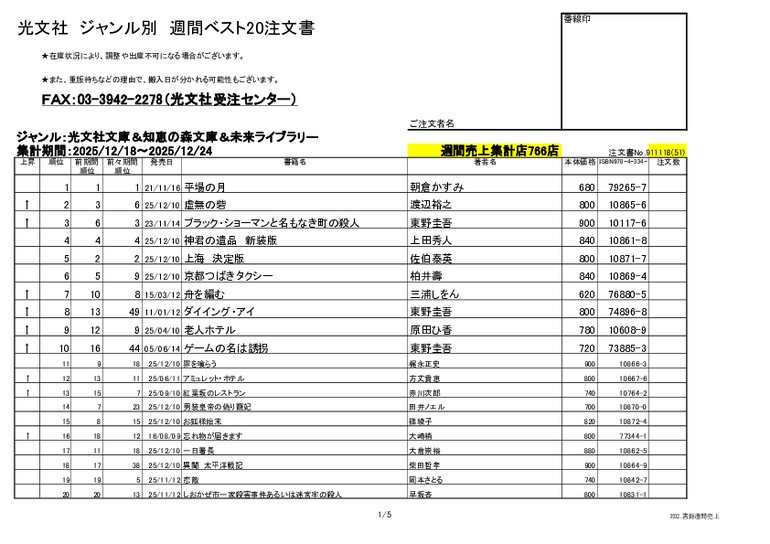 週間ベスト20の注文書を更新しました。(12/18~12/24売上分)
