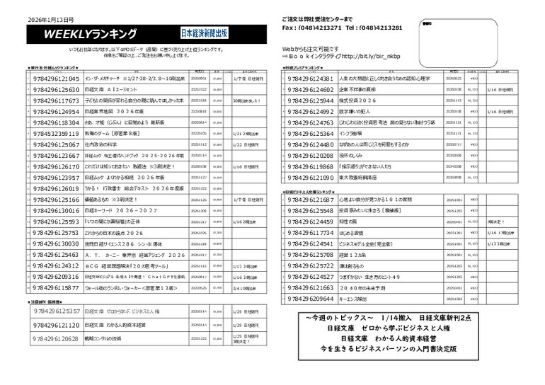 【日経BPマーケティング】WEEKLYランキング(日本経済新聞出版)