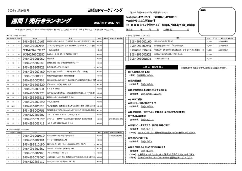 【日経BPマーケティング】週刊!売れ行きランキング(日経BP)