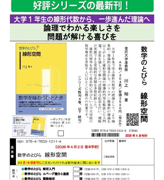 数学を志す学部2年生以上を対象に、1年生で学ぶ線形代数学の続論として、より抽象的・理論的な視点から、ジョルダン標準形の理論をはじめとした線形空間論の標準的内容を解説した入門書。
