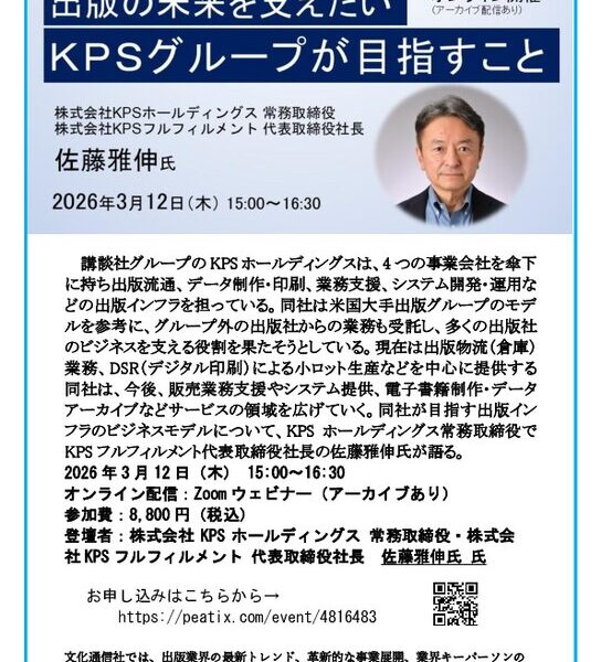 講談社グループのKPSホールディングスは、4つの事業会社を傘下に持ち出版流通、データ制作・印刷、業務支援、システム開発・運用などの出版インフラを担っている。同社は米国大手出版グループのモデルを参考に、グループ外の出版社からの業務も受託し、多くの出版社のビジネスを支える役割を果たそうとしている。現在は出版物流(倉庫)業務、DSR(デジタル印刷)による小ロット生産などを中心に提供する同社は、今後、販売業務支援やシステム提供、電子書籍制作・データアーカイブなどサービスの領域を広げていく。同社が目指す出版インフラのビジネスモデルについて、KPSホールディングス常務取締役でKPSフルフィルメント代表取締役社長の佐藤雅伸氏が語る。