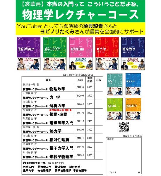 YouTuberとしても御活躍の須貝駿貴さんとヨビノリたくみさんに編集サポーターとして御参加いただいている、好評「物理学レクチャーコース」の既刊一覧です。4月の新刊を追加しました。